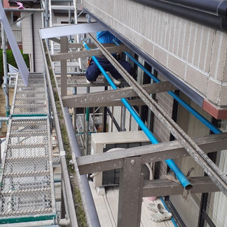 経年劣化により色あせや曇りが進み、所々で割れも発生していた既存のポリカ波板を撤去し、新しいポリカ波板へ張り替えを行いました。紫外線や風雨の影響で透明度が失われ、割れた部分からは雨水が入り込む恐れがありました。